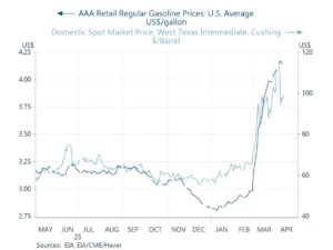 Second, retail energy prices have been adjusting quickly to the higher oil prices. As shown in Chart 1, through April 10, while oil prices have risen to $96.50/barrel from $65, a 48% increase, retail gasoline prices nationally have risen to $4.15/gallon, up from $2.97, a 40% rise. Before the Middle East conflict, there was backwardation in the oil price futures curve—the markets had priced in a gradual decline in oil prices from their then-current prices. (After the oil price surge, markets have priced in expectations that prices will fall back toward their earlier price level by later in 2026, but maintain a risk premium.) Prices of other refined oil products have risen even faster: diesel fuel have risen from $3.75/gallon to $5.68, a 51% increase.