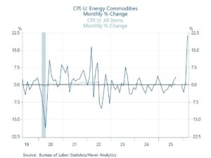 This dramatic rise in gasoline and diesel prices point to a very quick adjustment of retail prices. This suggests that the impact of the surge in crude prices on the CPI will be temporary, with the bulk of it in 2 months. I expect the residual impact will be relatively modest. Businesses will face some increases in operating costs, but the slowdown in aggregate demand growth–the anticipated outcome of a supply shock–is expected to constrain the pass through of higher operating costs to consumers. That is, a deceleration in aggregate demand will constrain the ability of businesses to raise product prices, and result in a one-time squeeze on select business margins. The residual impact of the oil price shock on the CPI beyond a several month temporary impact may be elongated a bit by the tax cuts of the OBBBA, which by increasing after-tax disposable income, may mitigate the impact of the negative oil shock on aggregate demand.
